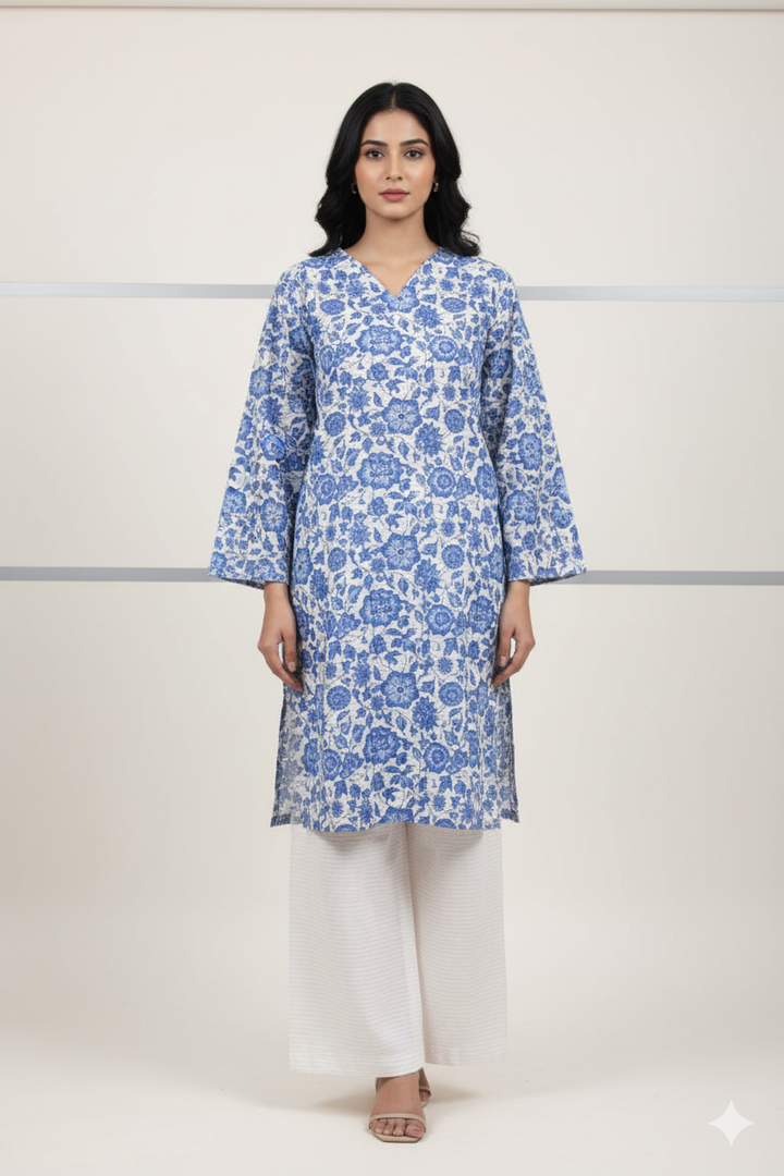 Embrace a fresh, clean look with this elegant 2-piece unstitched lawn suit. The long blue kameez and straight trousers are covered in a beautiful white floral print, creating a classic and timeless design. The V-neckline and wide sleeves add to its graceful silhouette, making it a perfect choice for effortless daily wear.